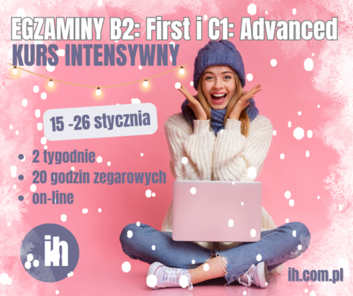 Oprócz warsztatów młodzieży proponujemy intensywny kurs przygotowujący do egzaminu ósmoklasisty i matury, a także do egzaminów B2: First oraz C1: Advanced. Szczegóły w zakładce: Ferie z IH. Zapraszamy!